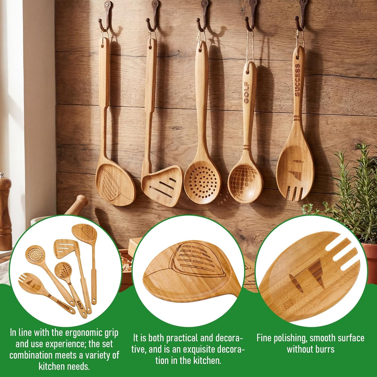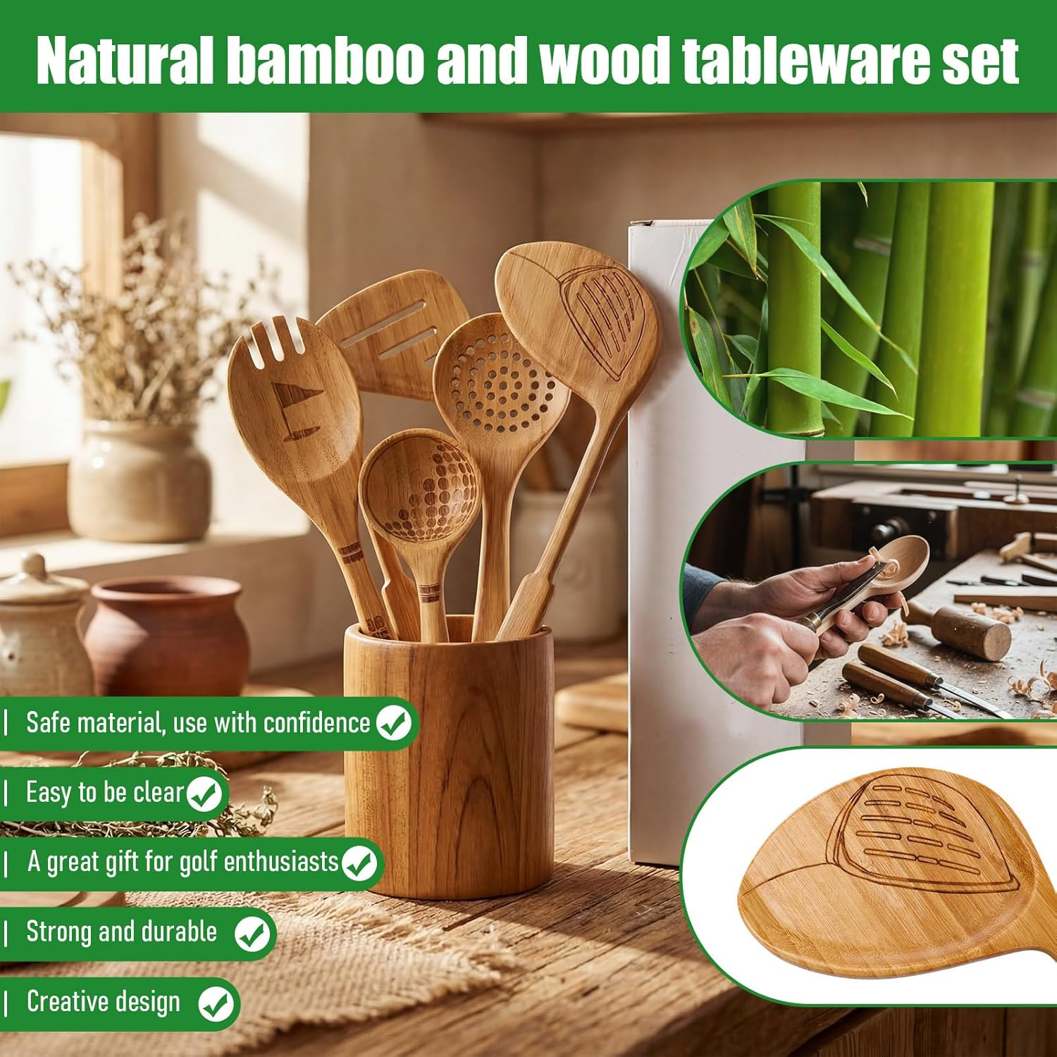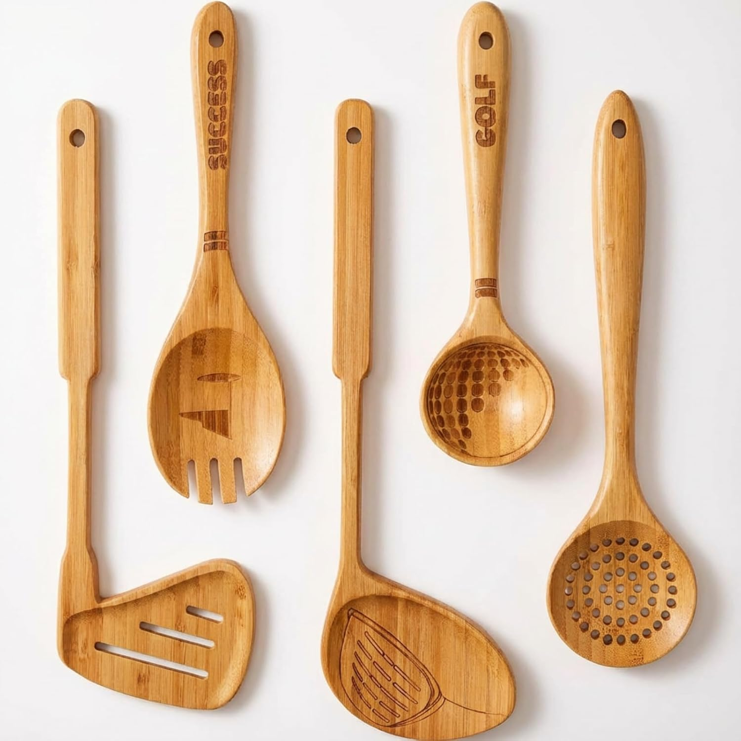- Reliable Materials: our golf wood kitchen utensils are made from quality bamboo, resistant to warping or breakage, finely crafted, burr-free, heat-resistant, and non-stick; They offer a comfortable grip, are safe to use, preserve the original flavor of food, and won’t scratch your pots and pans