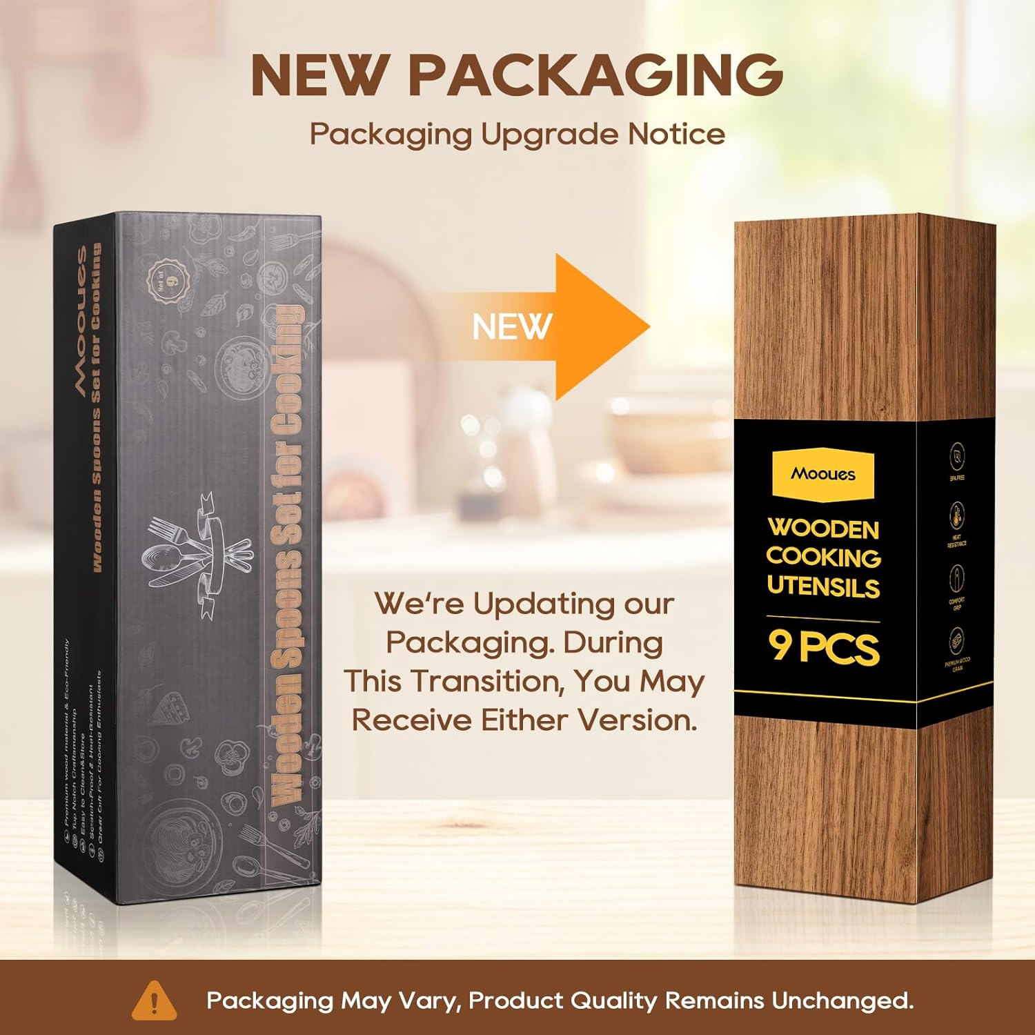- 9-Piece Wooden Spoon Set: A complete wood kitchen utensils that features all the essential cooking tools including a flat spatula, fried spatula, slotted spatula, kitchen utensil holder, spoons rest, strainer spoon, salad fork, salad spoon, mixing spoon. Covers all your kitchen needs from stirring to cooking